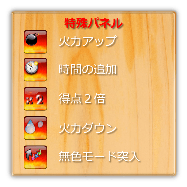 爆弾を増やしたり、時間を増やしたり、得点が2倍になるパネルがあるので有効に活用しよう。
